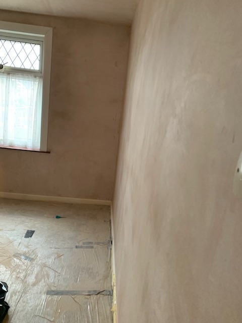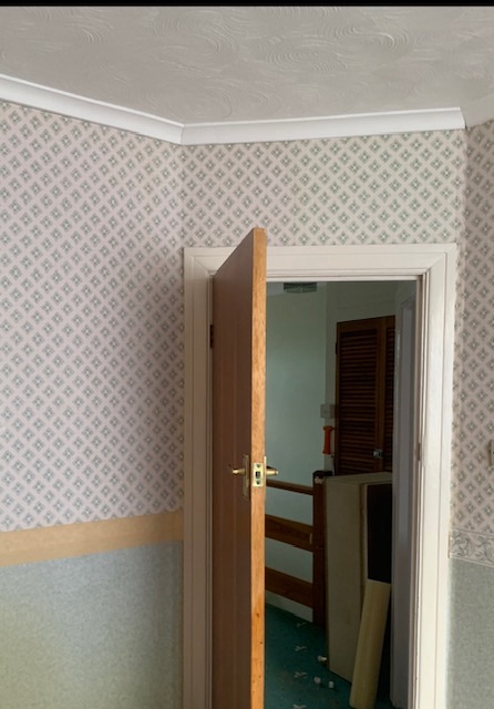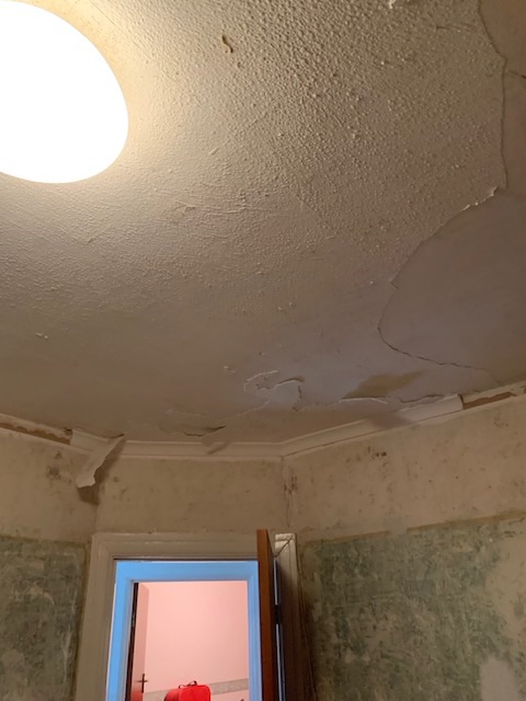 All bedrooms were wall papered and had polystyrene ceiling tiles, a favourite from the 1970s, the ceiling tiles were an absolute no no – they present a very real fire hazard and give off extremely toxic fumes that can lead to permanent injury to your lungs as well as rain down dripping plastic. All needed to be removed in order to paint. Upon removal of the wallpaper, however, it was discovered that the plaster beneath was in a state of disrepair was crumbly and powdery the walls would need to be re-plastered.